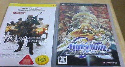 毎日昼過ぎに起きる→プロ野球観る→ロッテ惨敗でストレス溜まる→2ちゃんのロッテスレに書き込んで憂さ晴らし→またゴロゴロ→いつの間にか寝る という素晴らしくニー(略っぽい生活でした。何せこの4日間、外出したの最後の1日だけ、しかも夜でしたし。どれだけ引きこもりなんだ自分。でもこういう生活が一番性に合ってるんですよねえ。 ちなみに、最後の最後になんで外出したのかといいますと PSP買いに行ってました。友達が最近買った影響か何だか欲しくなってしまったので・・・。しかし連休の始めにでも買えば、連休中ずっとこれで遊べたのに、4連休の最終日のしかも夜にようやく買いにいくあたりが出不精の自分らしいというか何というか。 ちなみに買ったソフトは MPOとユグドラ・ユニオン。小島信者のはしくれである以上、MPOはやりたいゲームだったんですよねえ。ちなみにユグドラは完全にジャケ買いです。「GA」のきゆづきさとこセンセがキャラデザなんて反則すぐる・・・・・・。 モンハンもすごい話題になってるソフトだし、面白そうなので欲しいなとは思ったんですが、極めようと思ったらエライ時間がかかるみたいなので、とりあえずは様子見で。 |
