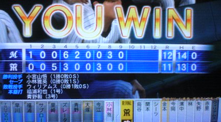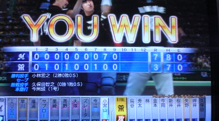 7回まで相手ピッチャーをほとんど打ち崩せず「これは負けかな・・・」と半分諦めていたんですが、8回怒涛の反撃。VSも当たりまくり一挙7得点で大逆転。相手には申し訳ないですが、これは快感でした(w これまでBBH3を40試合以上こなしてきましたが、今のところこれが一番のベストゲームです。 スコア見てもらえばわかるんですが、逆転に次ぐ逆転の連続。4回にVSが当たって福浦が満塁HRかっ飛ばしたのにも驚きましたが、VS使い切ってから5点取ったのは特筆に値します。 この試合が終わった後もあと1試合今度はオールスター軍団で試合をしたんですが、先ほどの試合で燃え尽きてしまったか、全くやる気が起こらず敗戦。それほど壮絶な試合でした。 PR